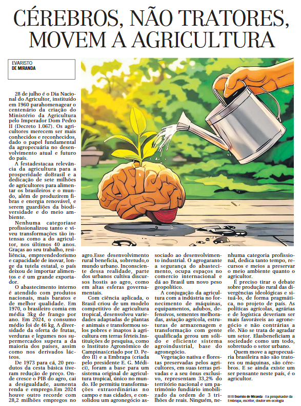 Miranda, E. E. de. Cérebros, não tratores, movem a agricultura. Correio Popular. Campinas – SP, 26 de julho de 2025. https://correiodigital.rac.com.br/jornal.php?0cc175b9c0f1b6a8=1474 https://evaristodemiranda.com.br/wp-content/uploads/2025/07/Cerebros-nao-tratores-movem-a-agricultura.png
