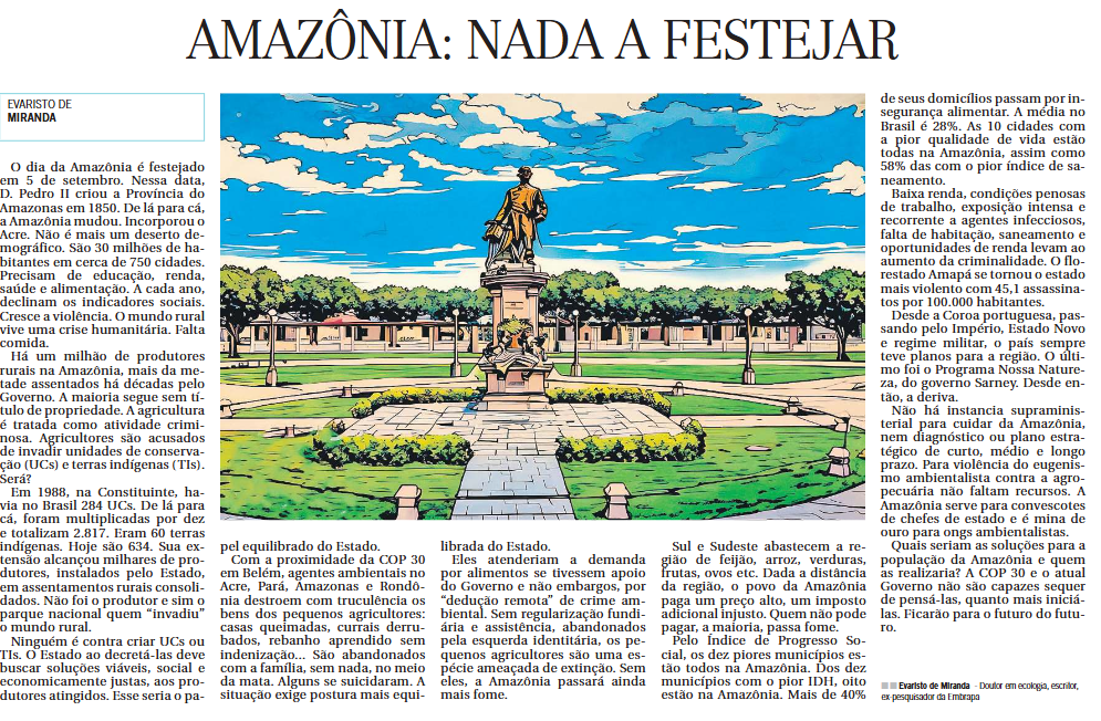 Miranda, E. E. de. Amazônia: nada a festejar. Campinas – SP, 05 de setembro de 2025. https://evaristodemiranda.com.br/wp-content/uploads/2025/09/AMAZONIA-NADA-A-FESTEJAR.pdf