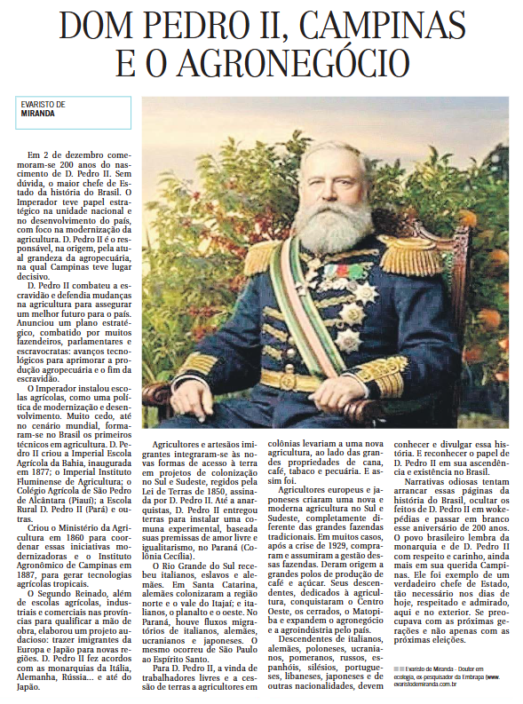 Miranda, E. E. de. Dom Pedro II, Campinas e o Agronegócio. Correio Popular. Campinas – SP, 02 de dezembro de 2025. https://correiodigital.rac.com.br/jornal.php?0cc175b9c0f1b6a8=1762 https://evaristodemiranda.com.br/wp-content/uploads/2025/12/Dom-Pedro-II-Campinas-e-o-agronegocio.png